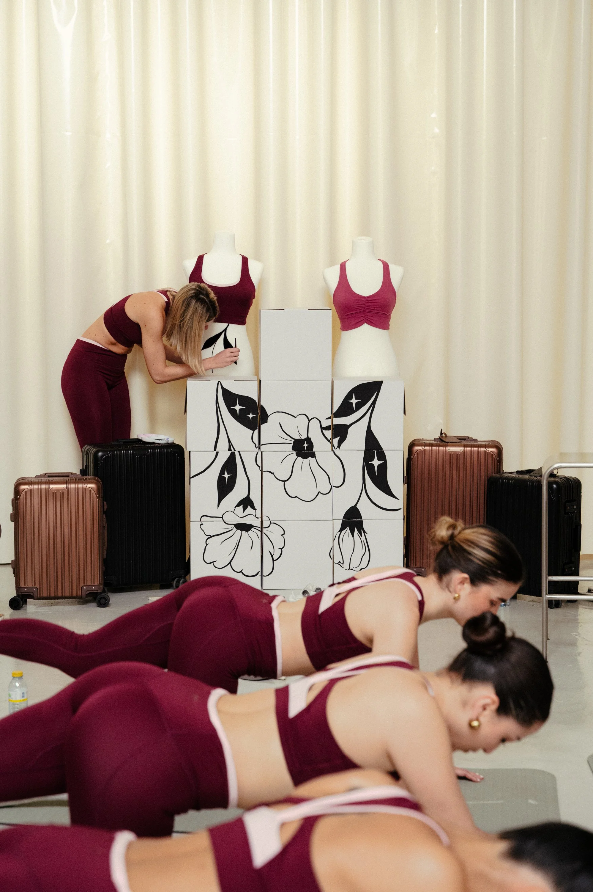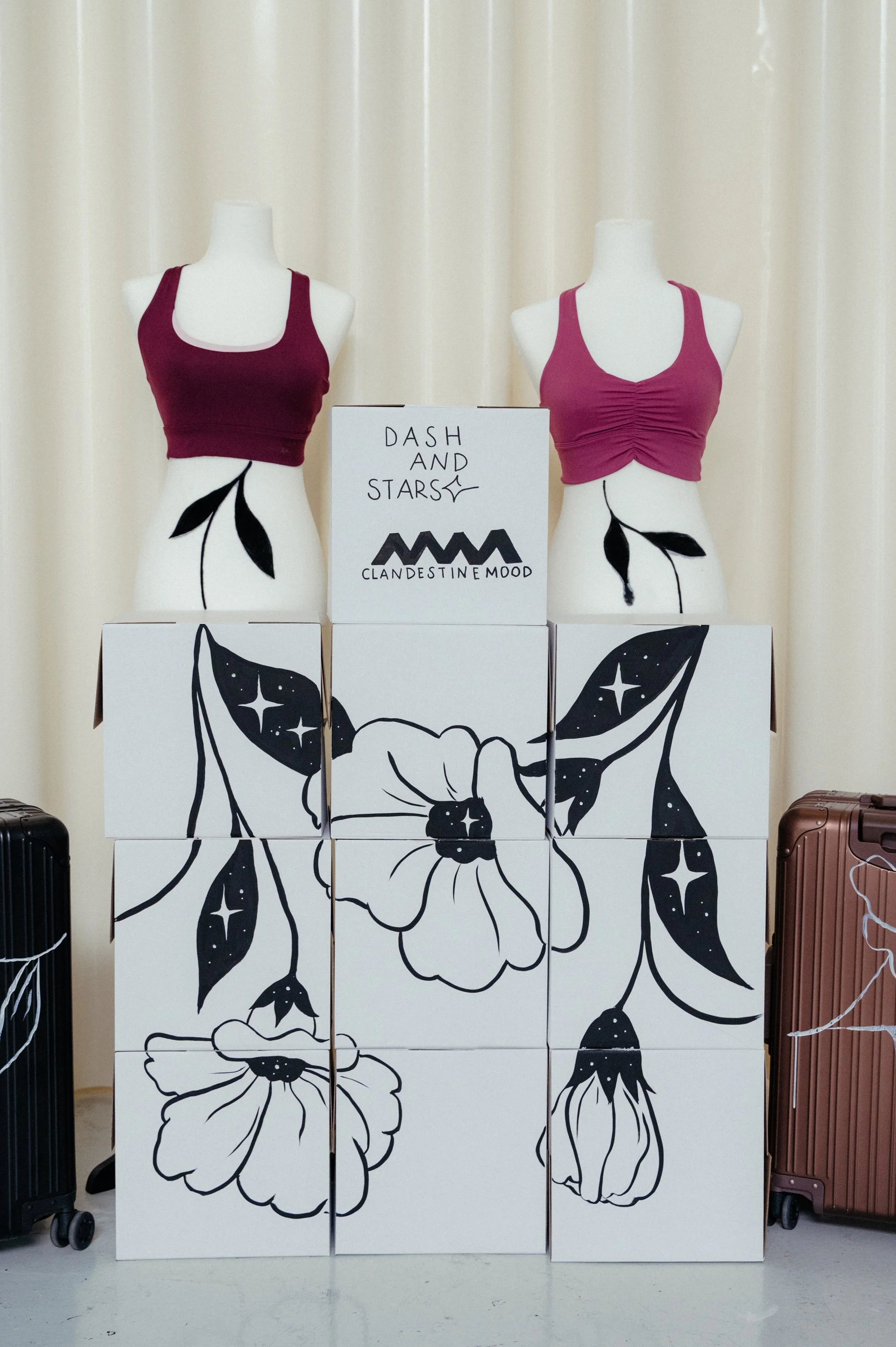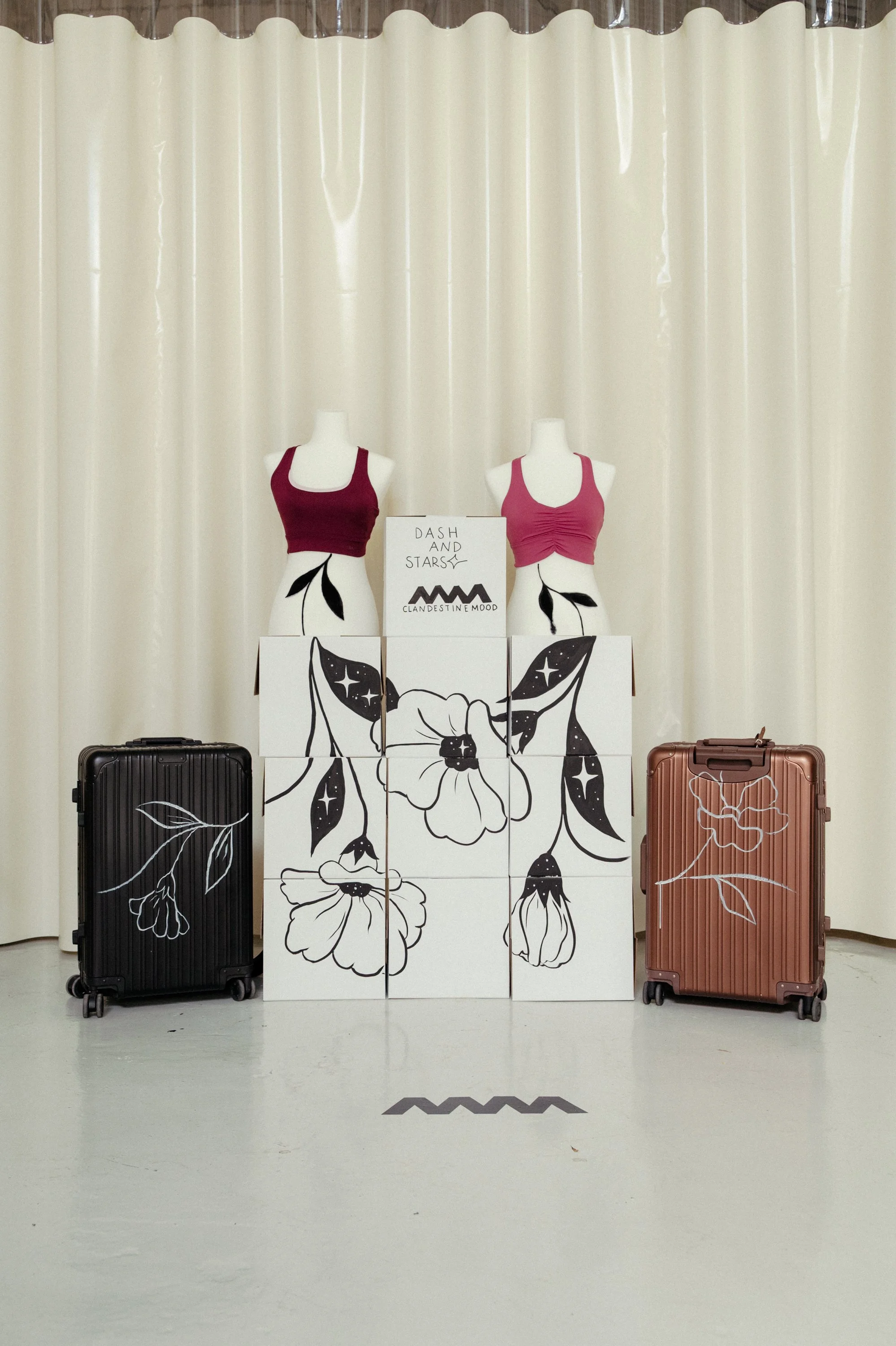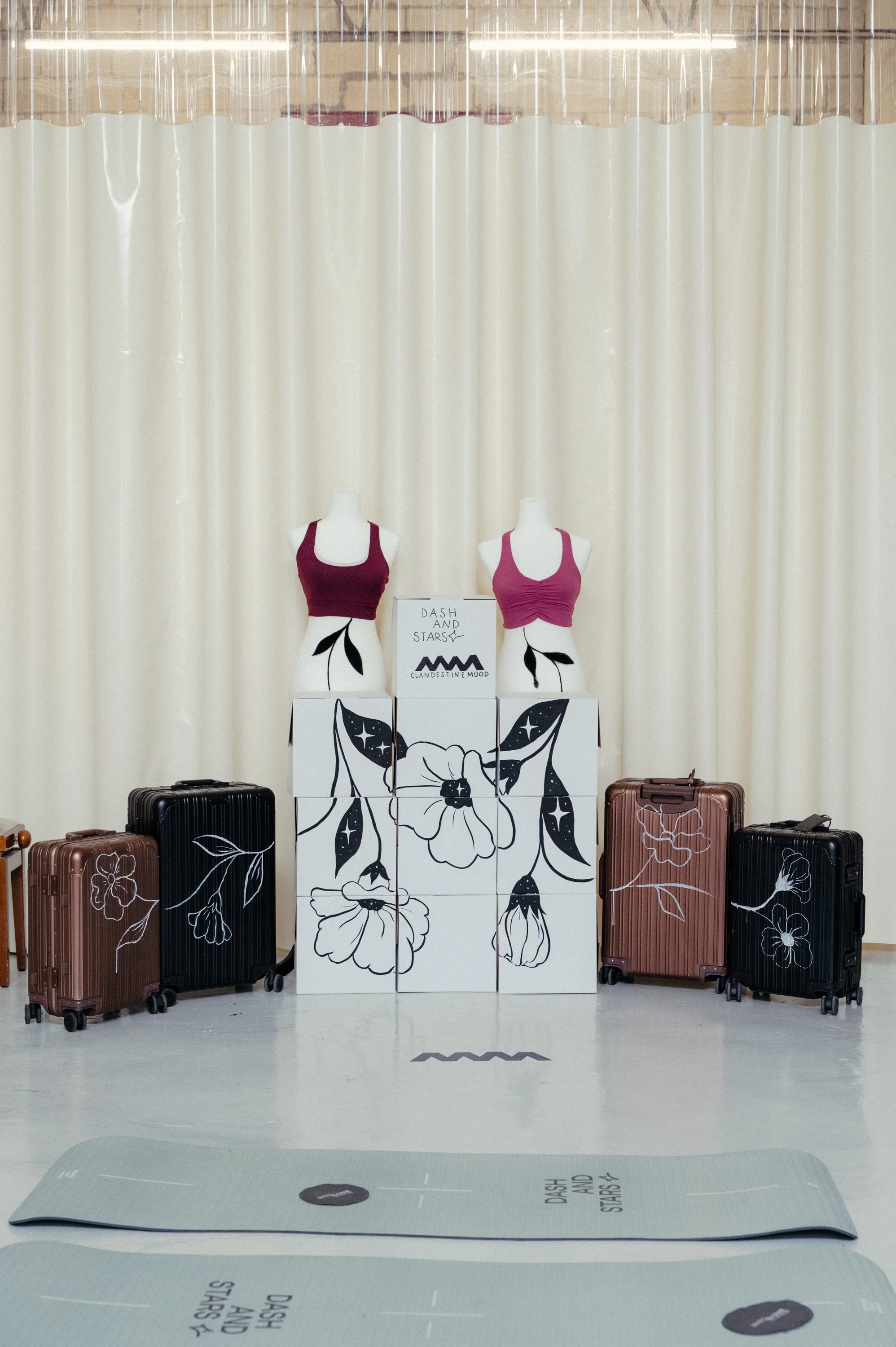 Clandestinemood celebra fiestas clandestinas para hacer deporte. En este caso se trataba de una colaboración con la marca de ropa deportiva Dash&Stars (Woman´s Secret) y la marca de electrodomésticos Create. Durante el evento se intervino la zona del photocall pintando bustos de la marca justo a unas maletas de Create.